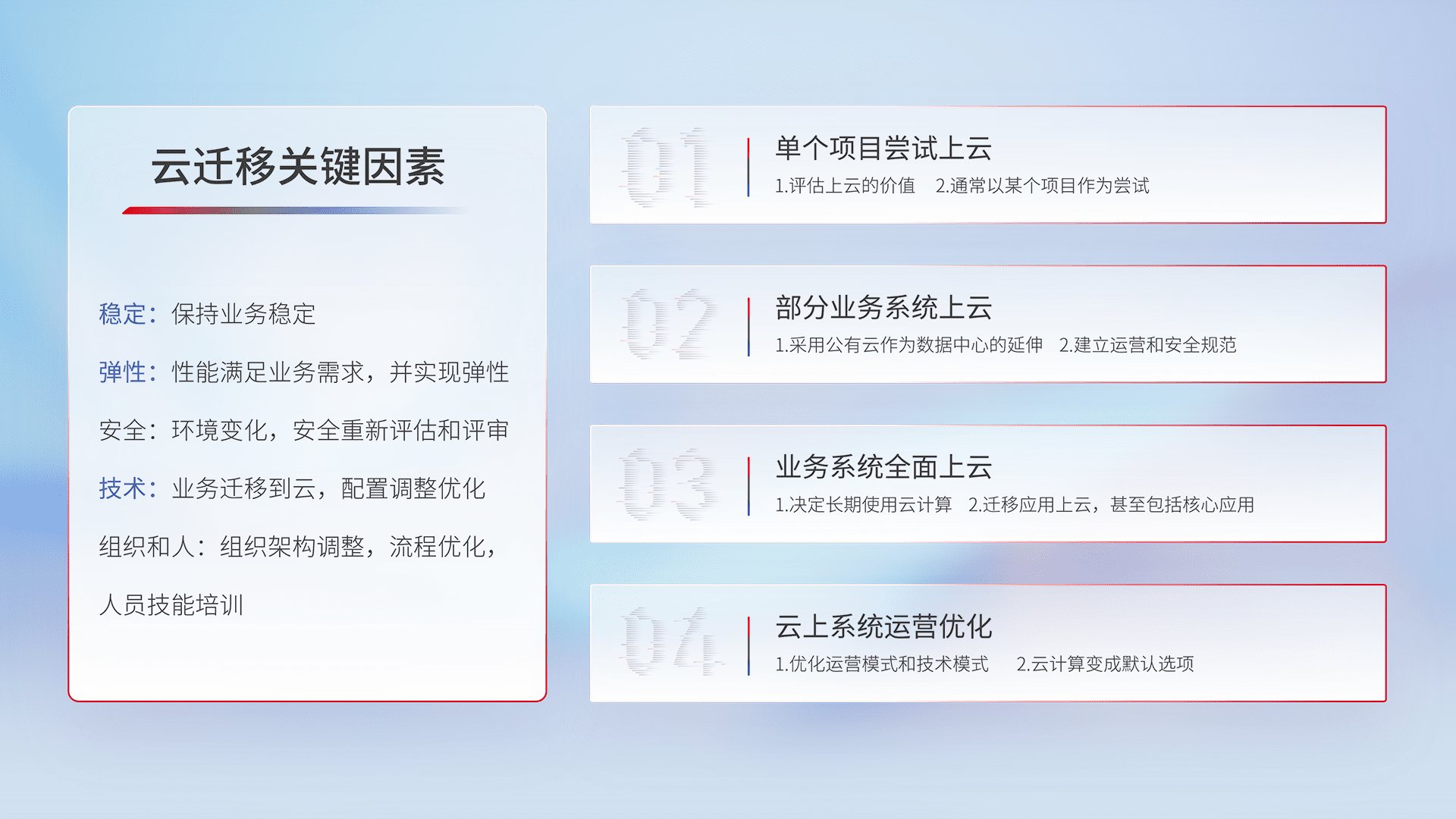 结合实际业务,,,,从规划设计、、云平台选型、、云原生改造、、、数据迁移、、集成交付,,,,迁移全过程为客户识别最佳上云路径,,,做好风险识别管理,,设计网络架构、、、、身份权限、、、、安全审计合规、、、操作审计、、、、日志审计、、监控告警策略、、、、多站点容灾设计等,,对云上基础设施进行整体规划,,,提升IT治理水平,,,,以满足弹性、、、、高可用、、、高性能的需求。。。