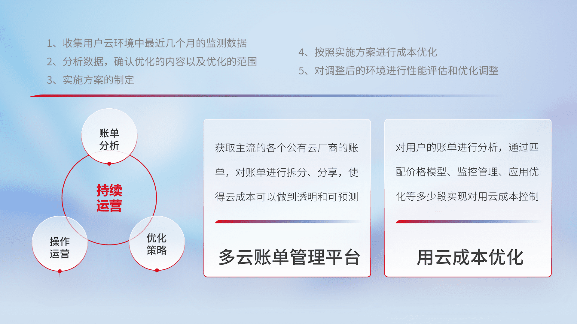 通过多云纳管,,,以统一的资源数据模型把客户的云资源进行抽象和封装,,,,进而实现对多云资源的统一操作,,,保障云资源管理的可靠性、、、稳定性与可用性。。量身定制化运维内容,,,配置、、、、开发运维、、补丁管理、、、、备份、、、监控、、、、认证和访问管理、、审计和日常巡检等,,,,保障在用云过程中的可靠度,,,,稳定度以及高可用率。。。
